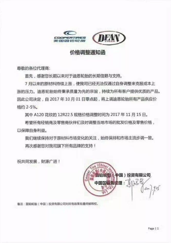 决定自2017年10月01日起,将上调迪恩轮胎所有产品供应价约2-5%,其中A210花纹的12R22.5规格价格调整时间为2017年11月15日。
