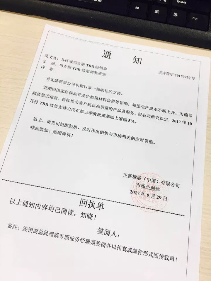 决定2017年10月5日起丁基内胎产品在原有价格基础上,上涨3%。