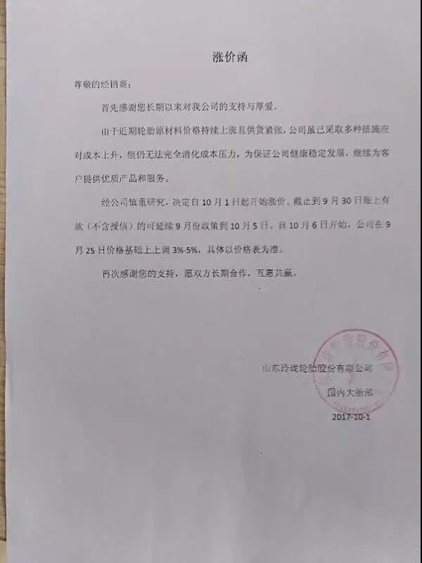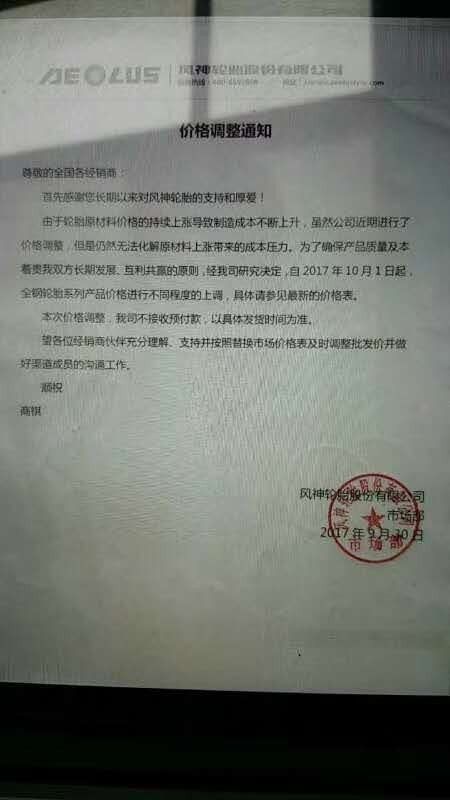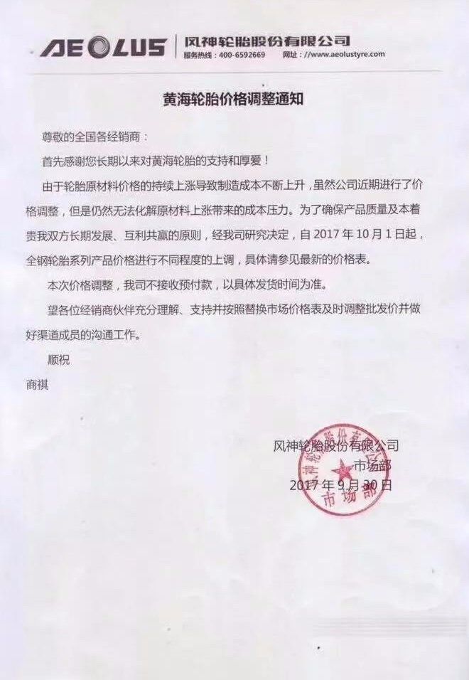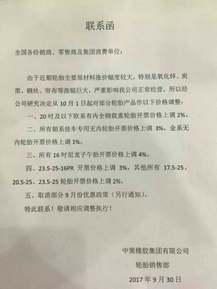 由于近期轮胎原材料价格持续上涨且供货紧张,公司无法消化成本压力,为了保证公司健康稳定发展,继续为客户提供优质产品和服务:经公司慎重研究,决定自10月1日起开始涨价。在9月25日基础上上调3%—5%,具体以价格表为准。