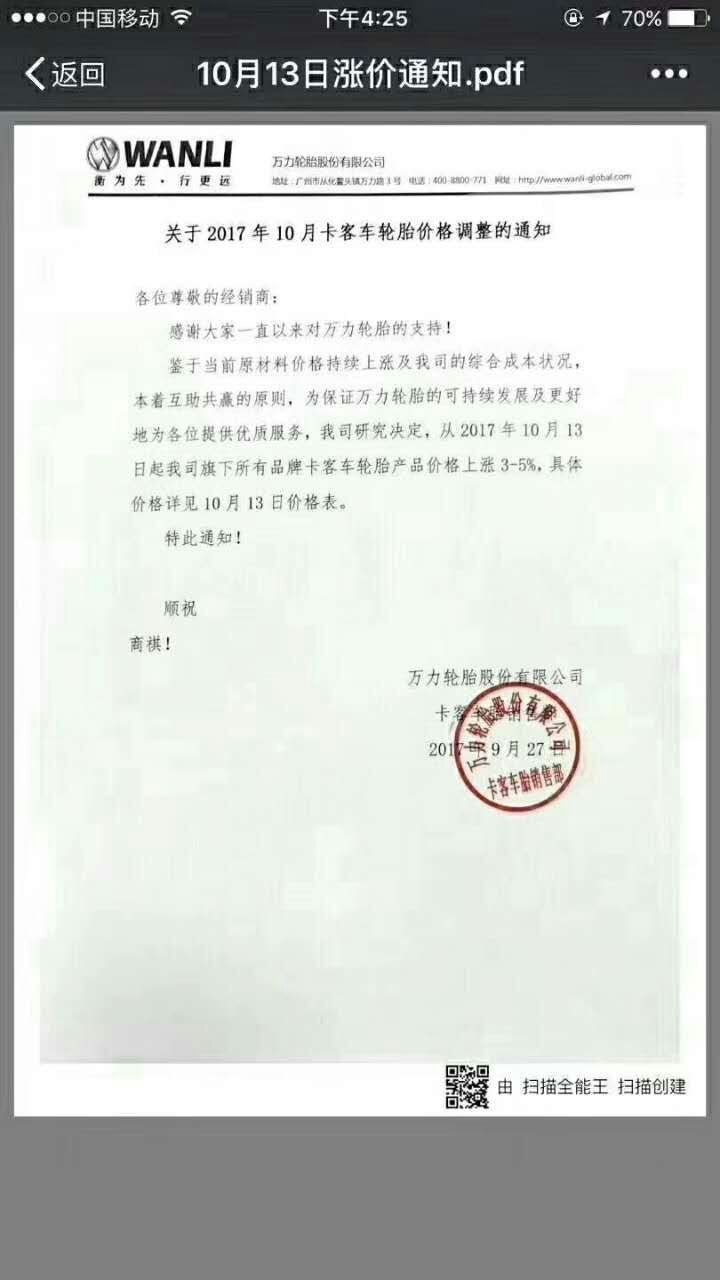 从2017年10月13日起,万力旗下所有卡客车轮胎产品价格上涨3%—5%,具体价格详见10月13日价格表。
