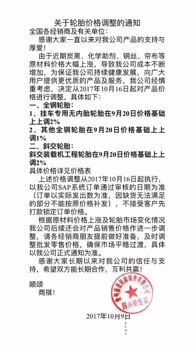 决定自2017年10月1日起,对全钢轮胎系列产品价格进行不同程度的上调。