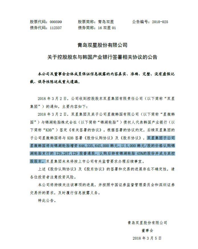 2018年3月2日,双星集团及其子公司星微韩国有限公司(以下简称“星微韩国”)与锦湖轮胎株式会社(以下简称“锦湖轮胎”)债权人代表韩国产业银行(以下简称“KDB”)签定《有关签署的协议》。