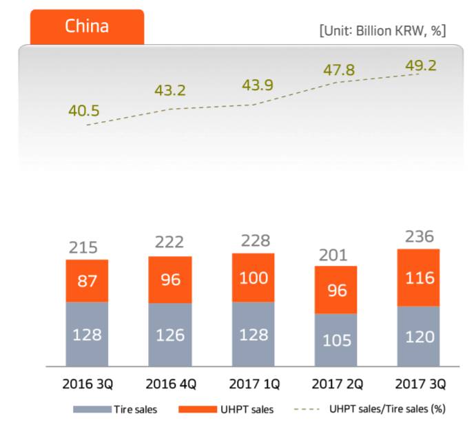 在中国市场,韩泰轮胎原配和替换市场表现均较好,销售额为4980亿韩元(人民币29.67亿左右),同比增长了400亿韩元。