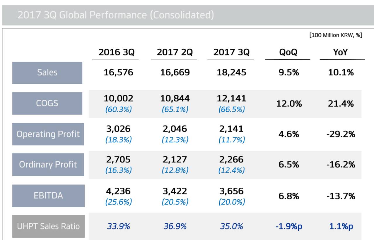 最近,韩国的韩泰轮胎发布了2017年第三季度财报。在财报中,韩泰称由于原材料的成本压力,第三季度制造成本上涨了21.4%,营业收入降低了29.2%,营业利润降低了16.2%。下面是韩泰第三季度的具体报表。